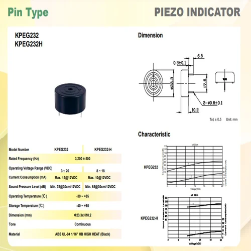 The KPEG232 & KPEG232H Piezo Buzzers are high-quality, compact audio indicators designed for industrial, automotive, and consumer electronics. Operating at 12V DC, they deliver a clear 75dB sound pressure level at 30cm. Featuring a continuous tone output and a durable ABS UL-94 High Heat (Black) body, these buzzers are reliable even in high-temperature environments. The pin-type installation ensures easy and secure mounting in a variety of electronic circuits and control panels.