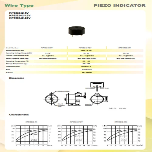 The KPEG242 Piezo Buzzer Module is a compact and high-performance audio indicator suitable for industrial, automotive, and electronic applications. Operating at 24V DC, it produces a loud 92dB sound pressure level at 10cm, ensuring effective and noticeable alerts. With a continuous tone output and a durable PBT (Black) body, it performs reliably across a wide temperature range. The pin-type installation allows easy and secure mounting in various circuits and control panels.